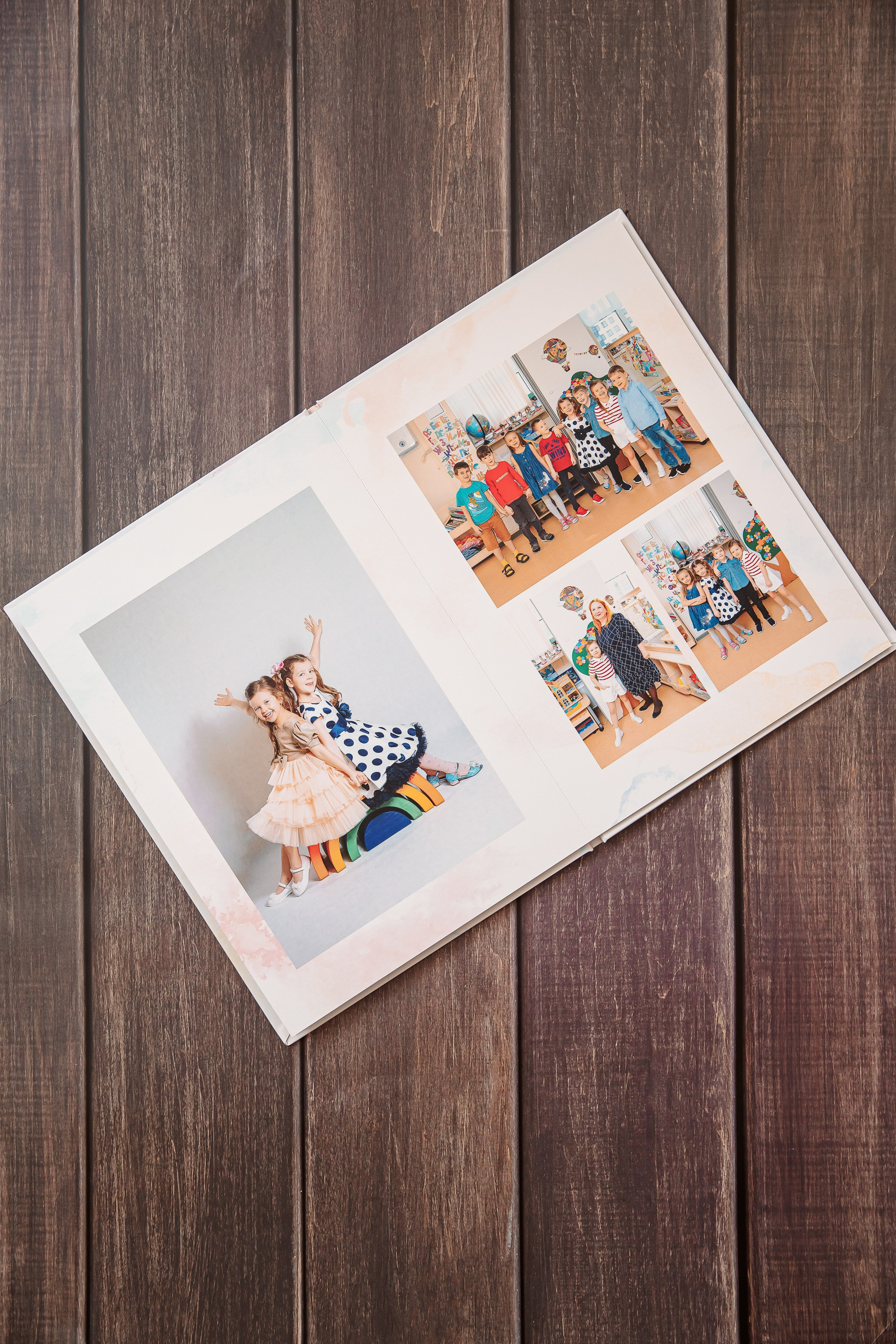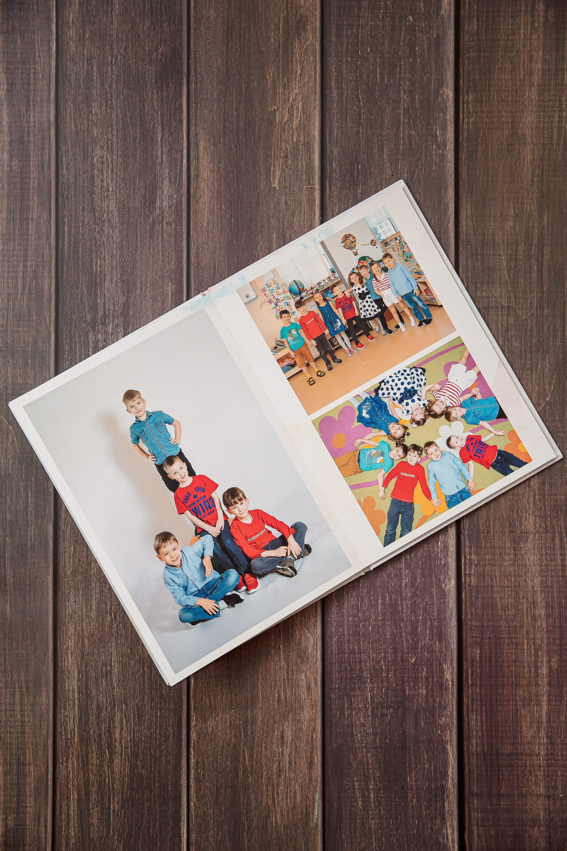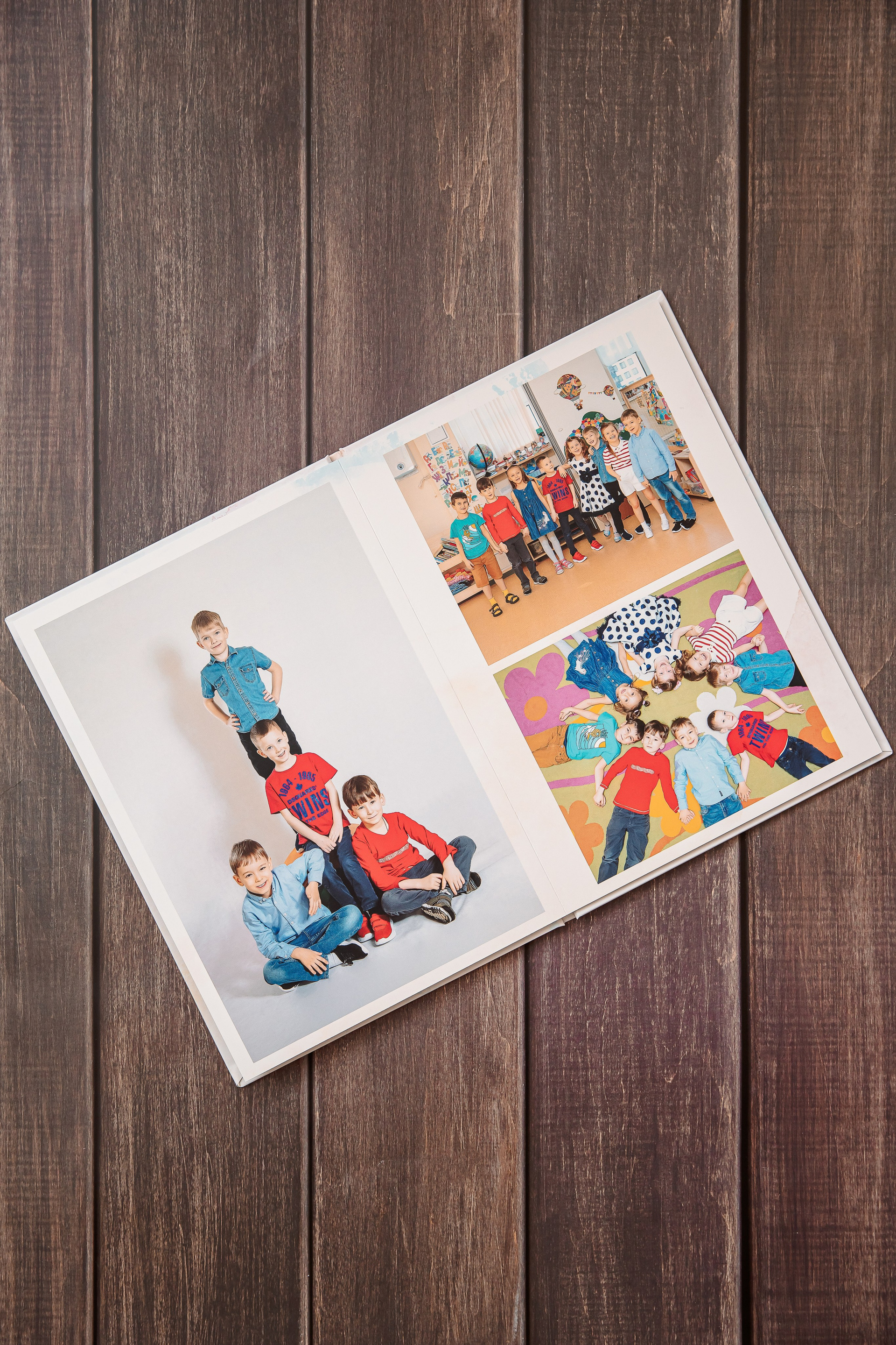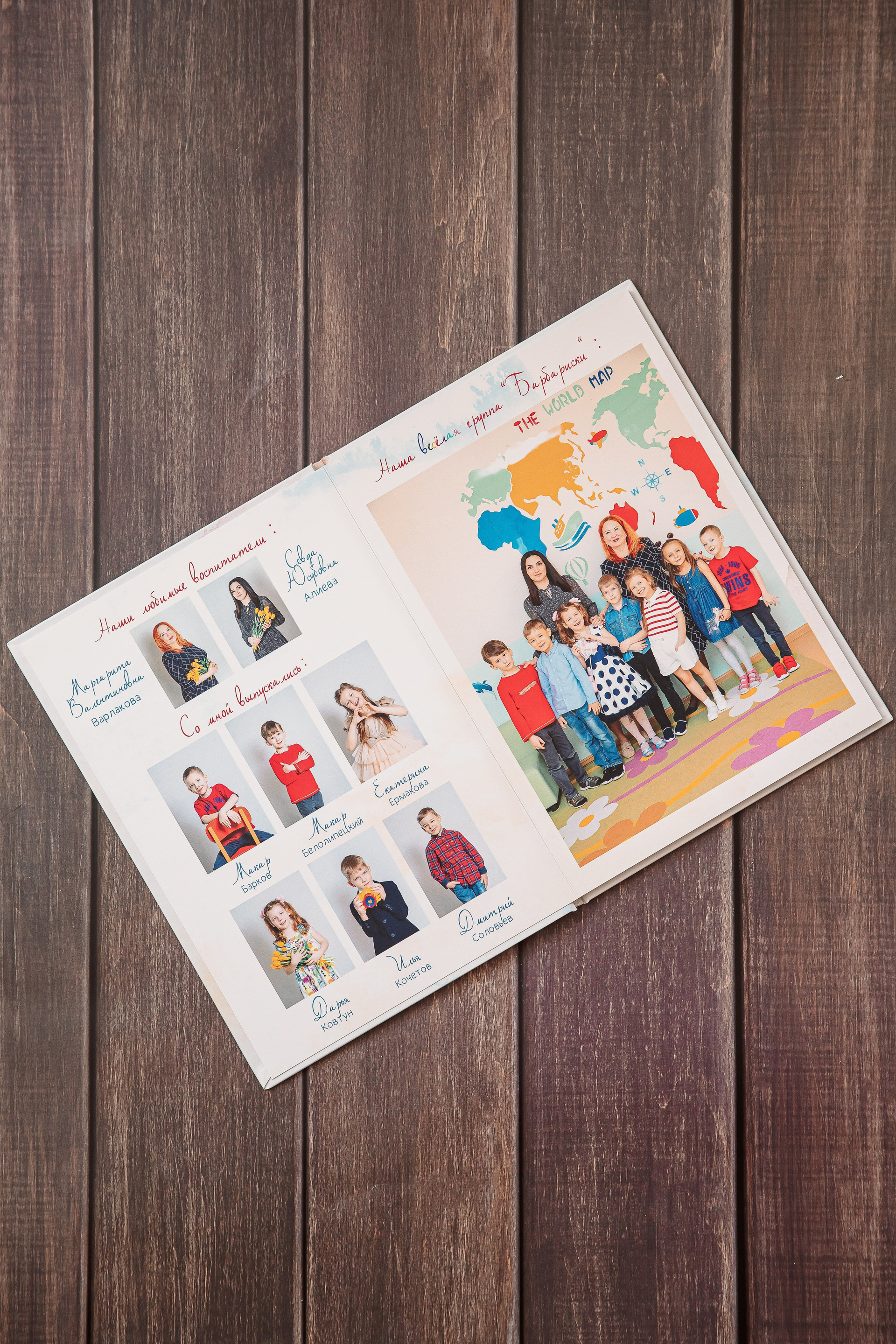Эти альбомы были сделаны для выпускников группы Монтессори, т. е. разновозрастной группы. Как правило в таких группах выпускается небольшое количество детей. В данной группе выпускались 6 детей (и 2 альбома нужно было сделать в подарок воспитателям). Для съемки нам потребовалось около 3 часов. За это время успели сделать разные индивидуальные портреты каждому выпускнику и воспитателям, отснять видео для оживления портретов педагогов, а также снять немного кадров с друзьями в группе.
