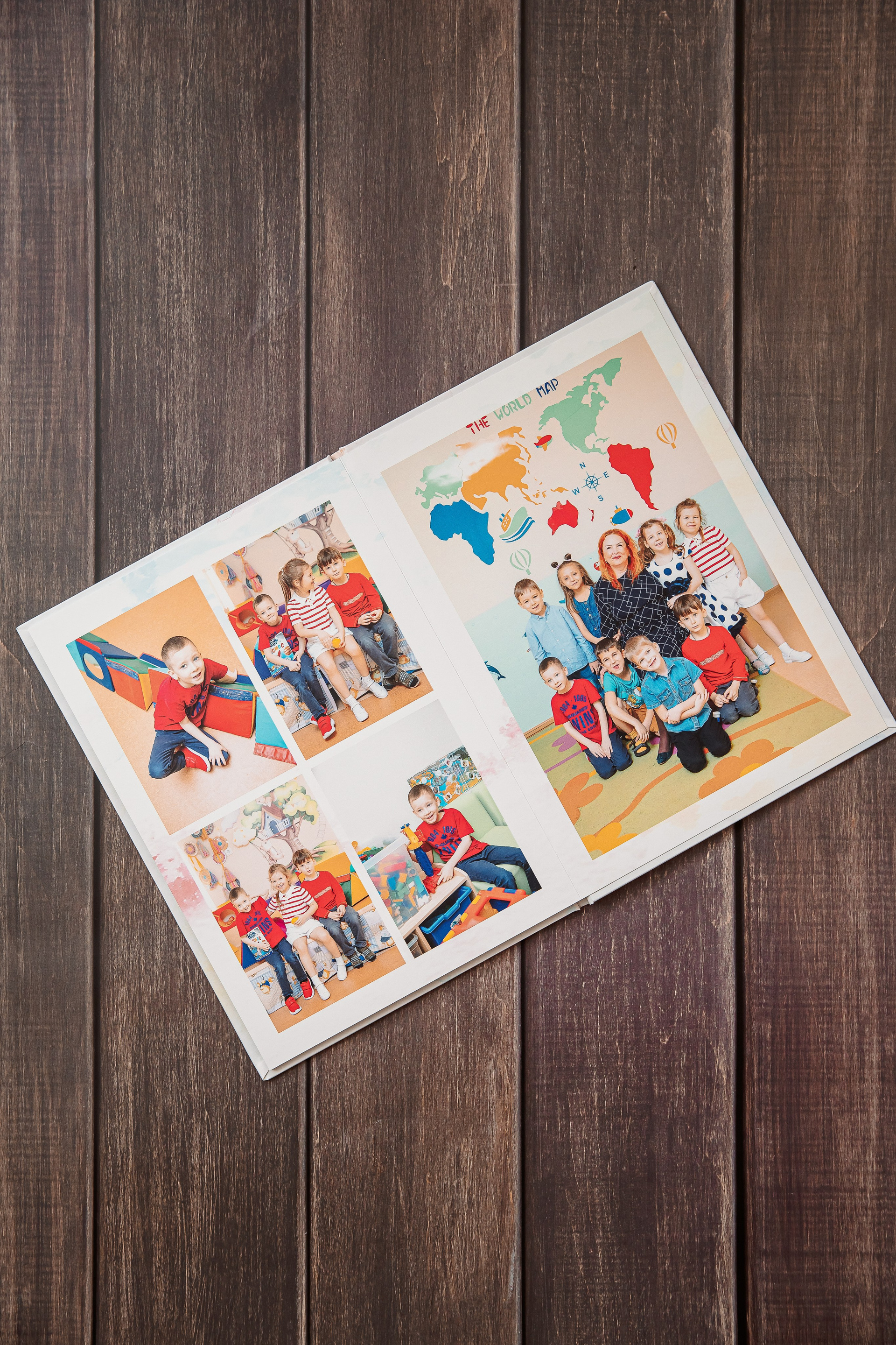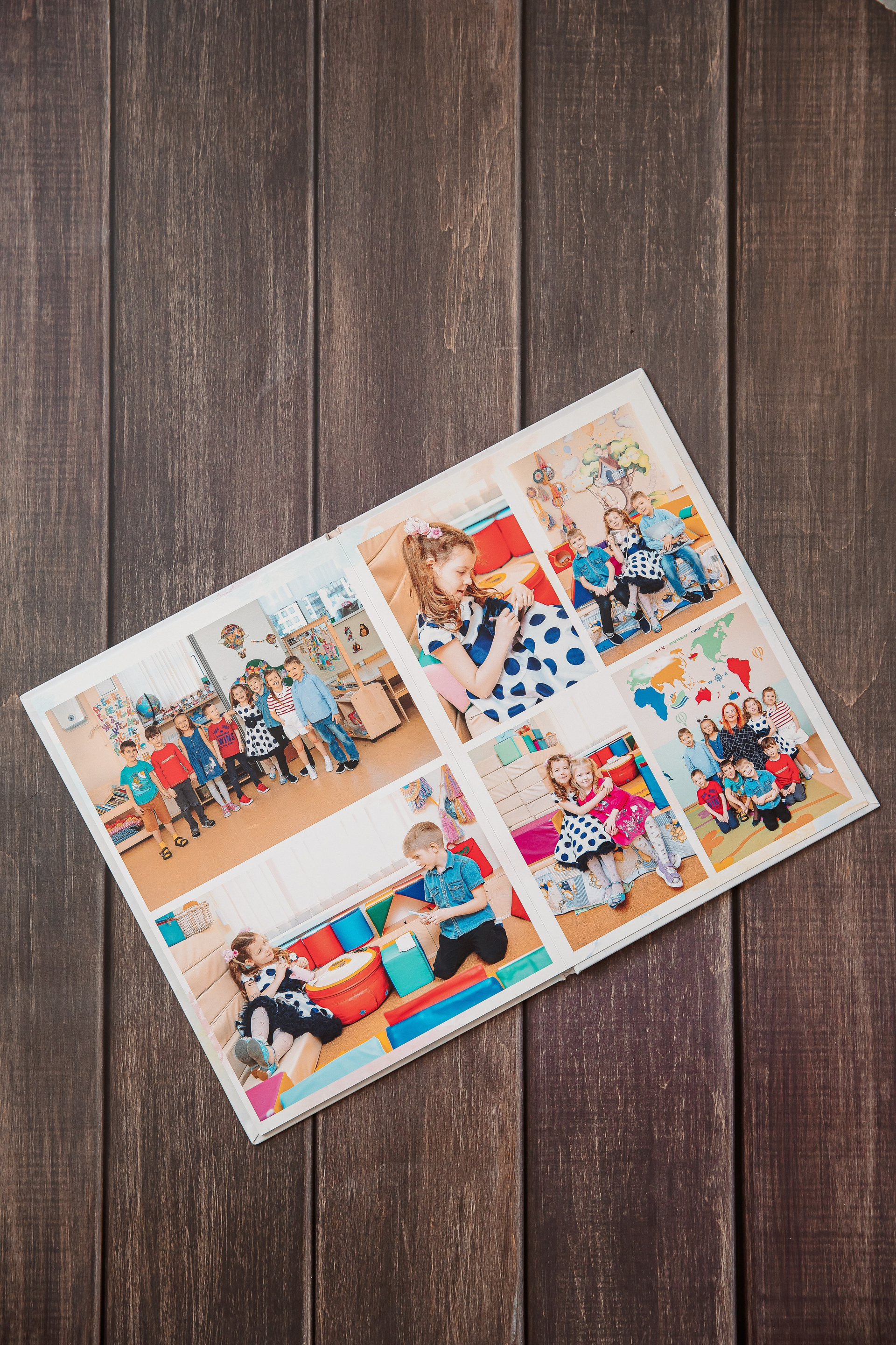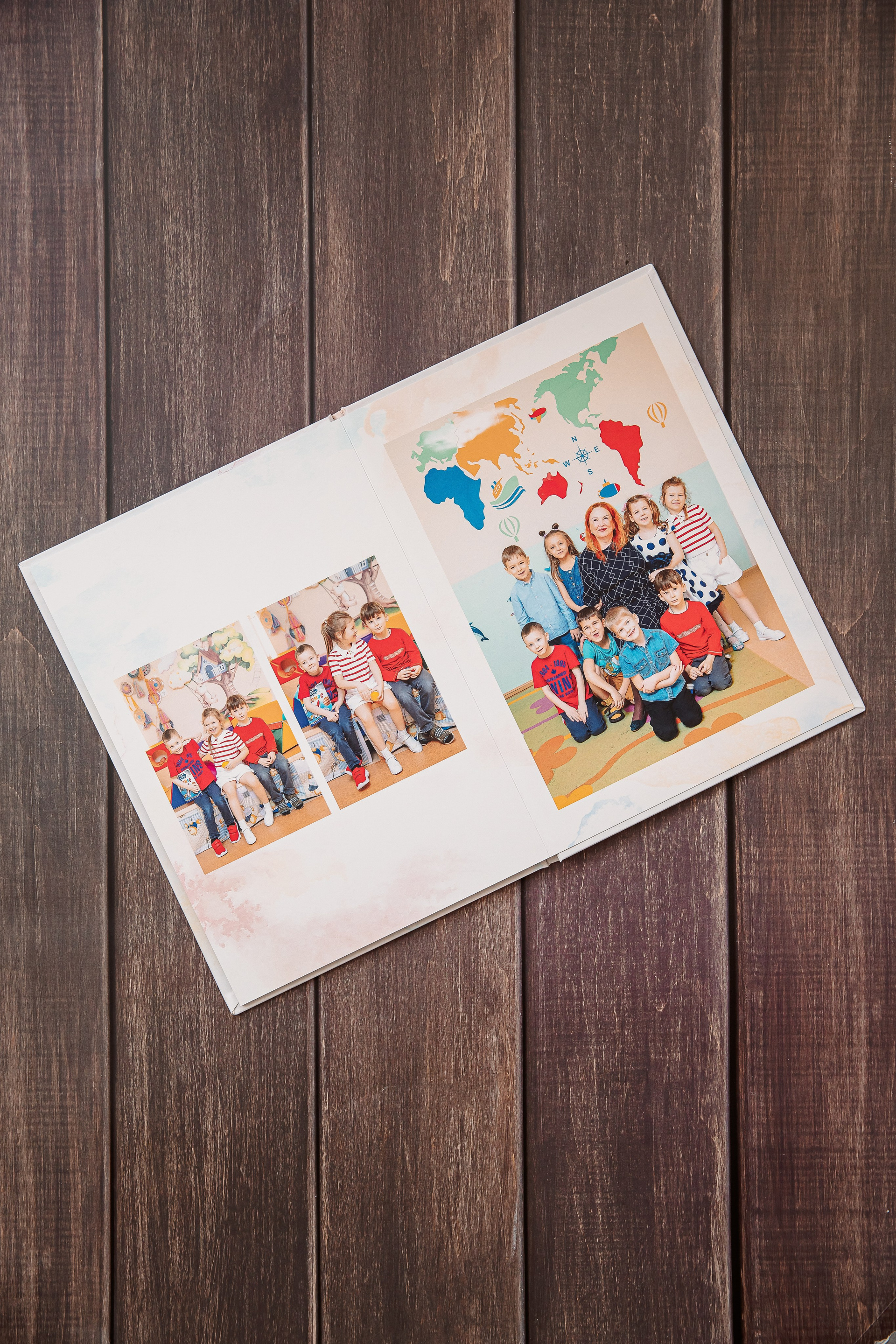 Эти альбомы были сделаны для выпускников группы Монтессори, т. е. разновозрастной группы. Как правило в таких группах выпускается небольшое количество детей. В данной группе выпускались 6 детей (и 2 альбома нужно было сделать в подарок воспитателям). Для съемки нам потребовалось около 3 часов. За это время успели сделать разные индивидуальные портреты каждому выпускнику и воспитателям, отснять видео для оживления портретов педагогов, а также снять немного кадров с друзьями в группе.