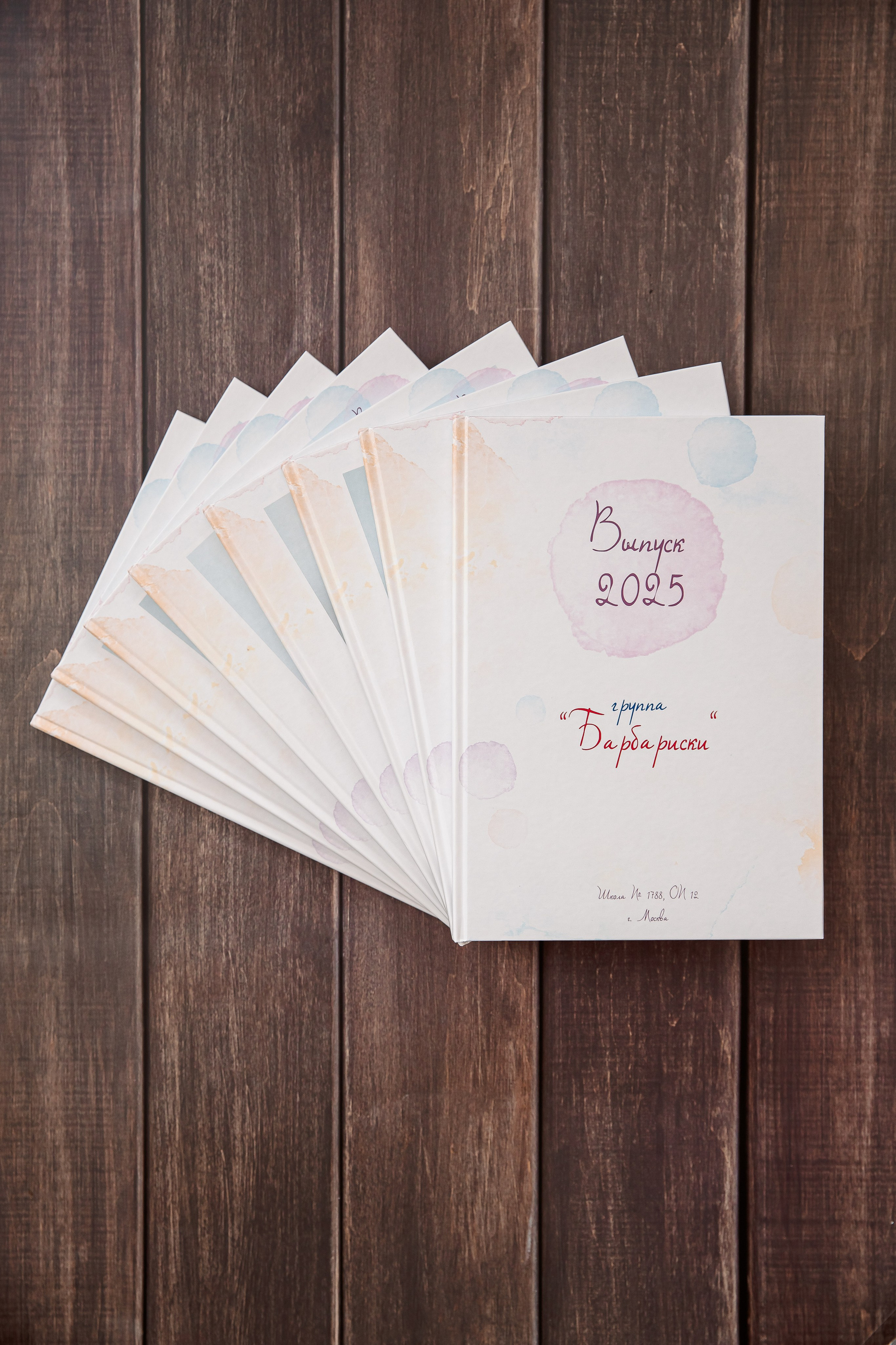 Альбомы на 4 разворота. Первый разворот одинаковый у всех, остальные 3 у каждого свои. Плюс на лицевой стороне обложки индивидуальный портрет выпускника.