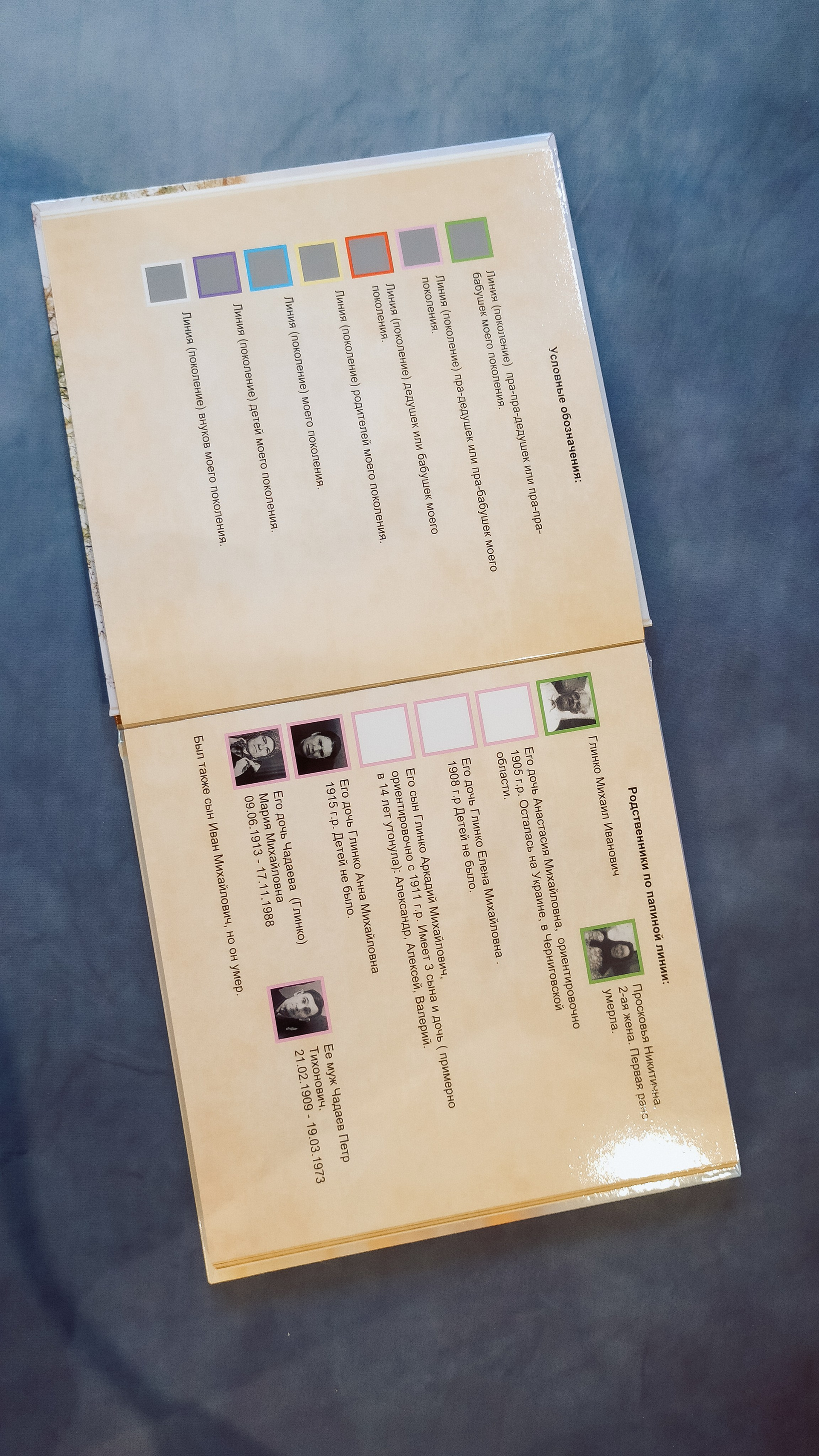 В книге 36 разворотов. Информация, начиная с прапрапоколения. Для удобства каждое поколение я обозначила цветом. Здесь могу показать вам только несколько разворотов, для понимания, какая информация собрана в этой книге. Но это, конечно, только маленькая часть.