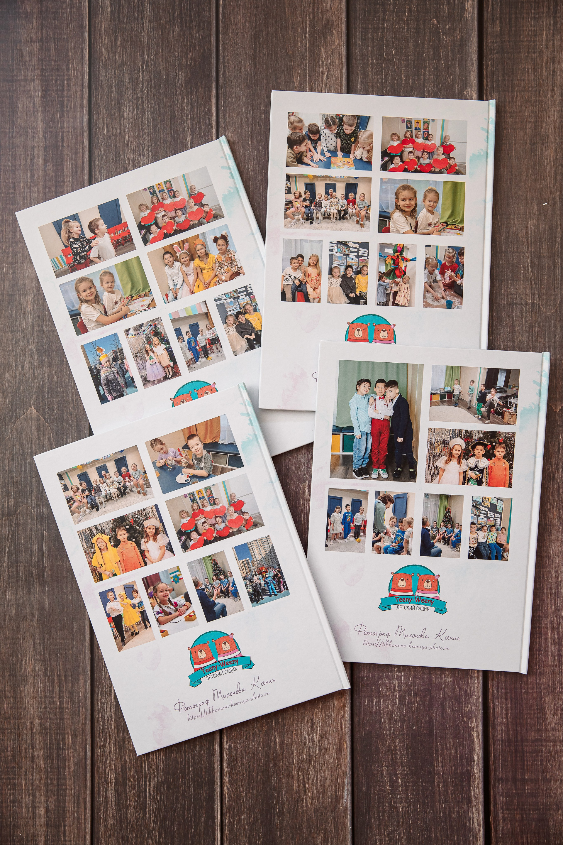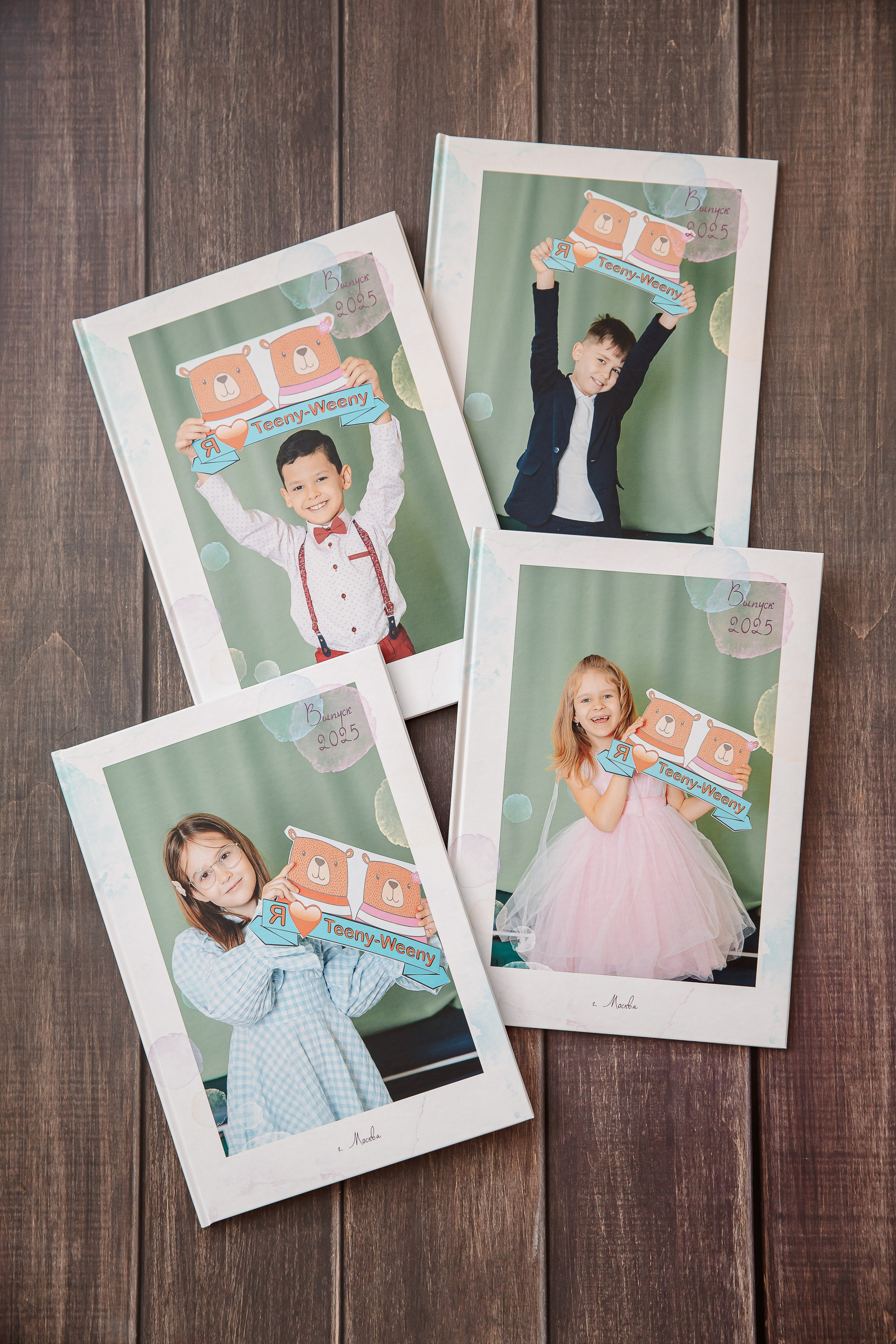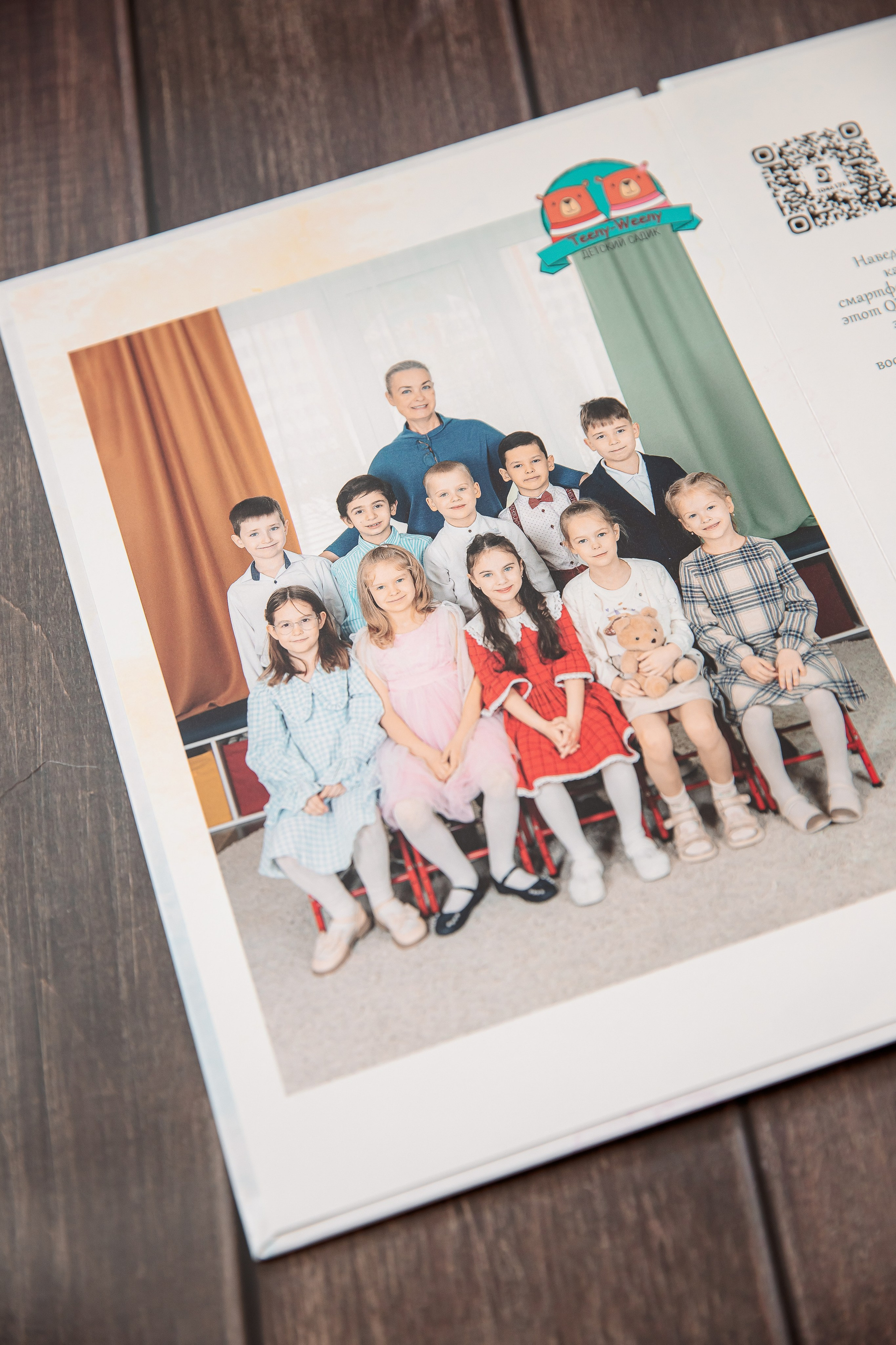 Эти планшеты были сделаны в качестве подарка от детского сада Teeny-Weeny своим выпускникам. Заказчик помимо общего фото всей группы и портретов детей и воспитателя хотел разместить по несколько фотографий из жизни детей в саду. Поэтому мы решили сделать это на задней стороне обложки. А на передней стороне разместили портрет того выпускника, кому предназначался данный альбом. Также добавили логотип детского сада, поэтому планшеты получились брендированными.