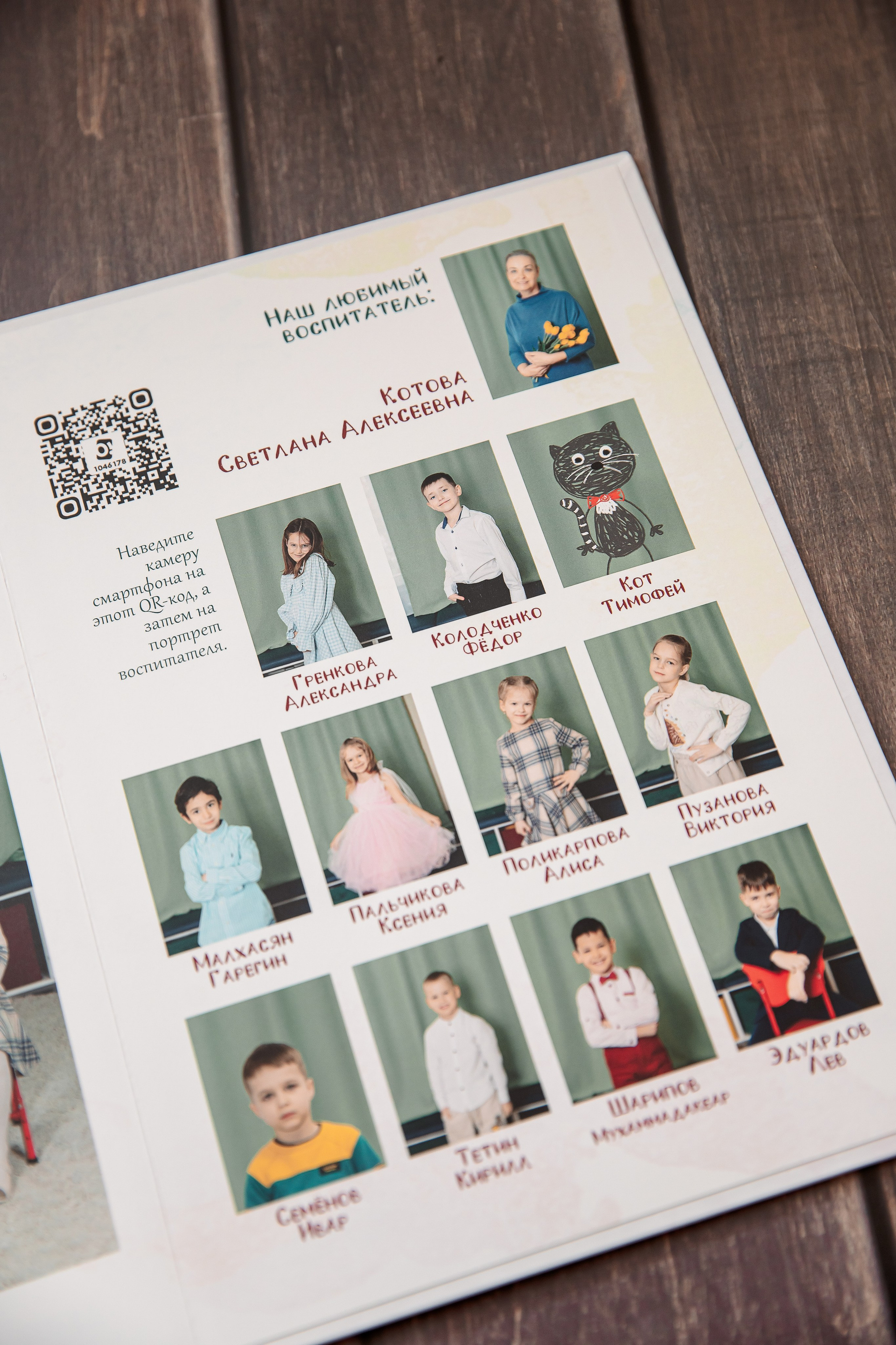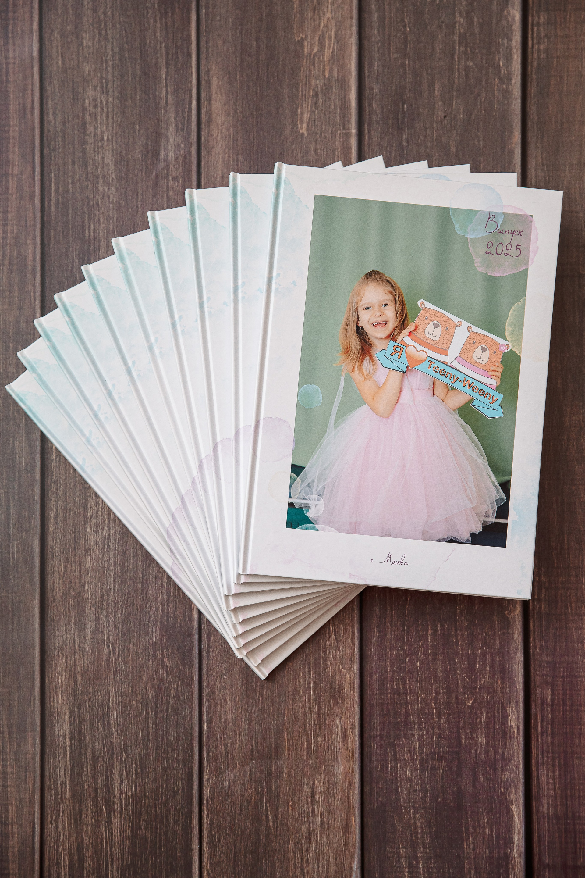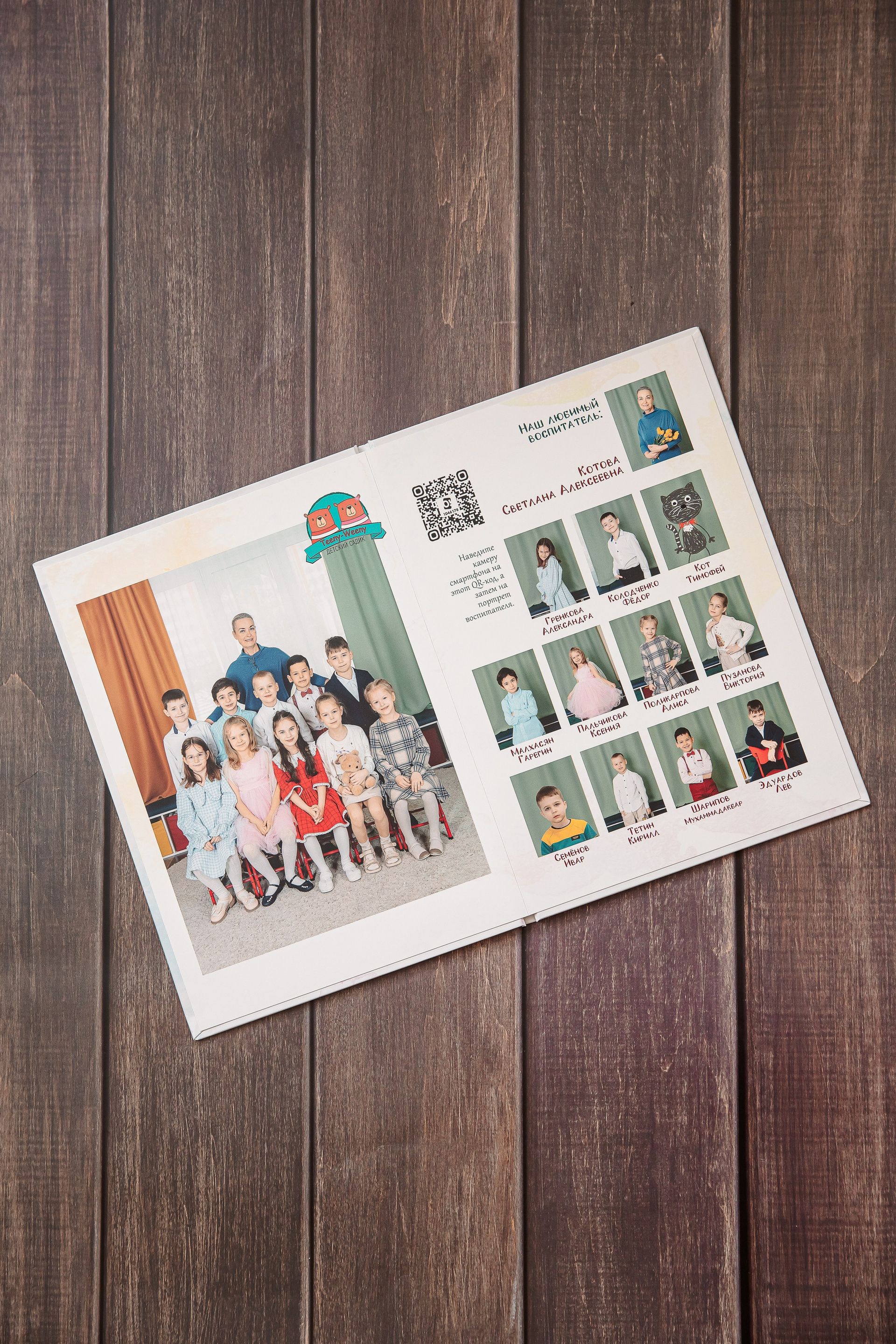 Эти планшеты были сделаны в качестве подарка от детского сада Teeny-Weeny своим выпускникам. Заказчик помимо общего фото всей группы и портретов детей и воспитателя хотел разместить по несколько фотографий из жизни детей в саду. Поэтому мы решили сделать это на задней стороне обложки. А на передней стороне разместили портрет того выпускника, кому предназначался данный альбом. Также добавили логотип детского сада, поэтому планшеты получились брендированными.